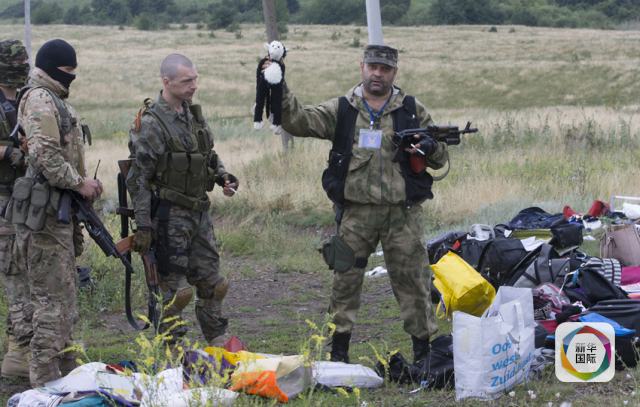 2014年7月18日,一名當(dāng)?shù)孛耖g武裝人員在烏克蘭頓涅茨克州格拉博夫附近的馬航客機墜機現(xiàn)場拿起一個玩具。新華社/美聯(lián)