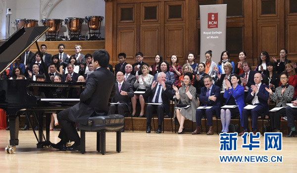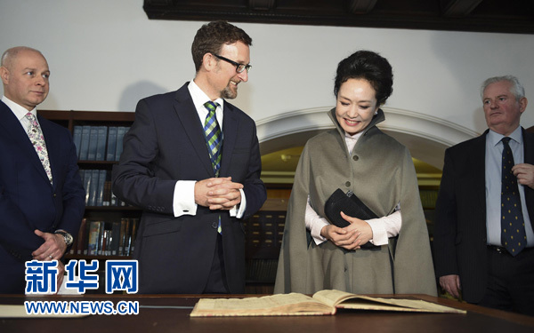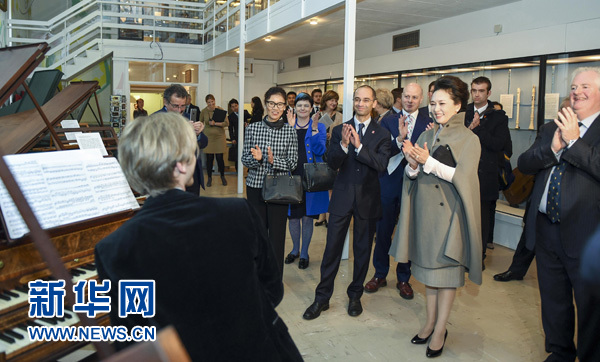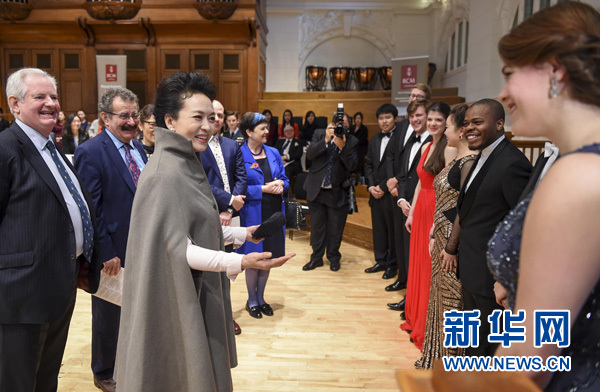 彭麗媛抵達時,受到皇家音樂學(xué)院董事會主席溫斯頓勛爵、學(xué)院院長、英國友人等熱烈歡迎。在院長陪同下,彭麗媛欣賞了獲獎學(xué)生和校友精彩的聲樂、器樂表演,參觀了樂器博物館,觀賞了圖書館珍藏的莫扎特、肖邦等音樂大師創(chuàng)作手稿,并同學(xué)院師生進行交流。彭麗媛表示,音樂作為一種高尚的藝術(shù)形式,超越國家、民族、歷史、文化界限?;始乙魳穼W(xué)院培養(yǎng)出眾多世界級藝術(shù)家。中國有不少音樂作品享譽世界,希望皇家音樂學(xué)院今后加強同中國音樂院校的交流,為促進中英教育和藝術(shù)合作貢獻力量。
