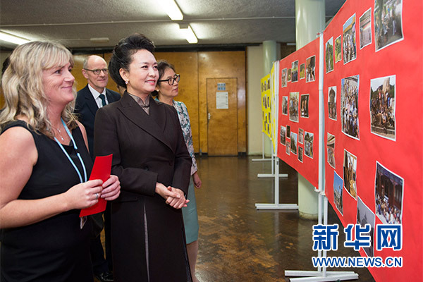 在英國教育部國務(wù)大臣吉布、學校校長等陪同下,彭麗媛觀看學生們用中文進行的才藝表演,參觀學校成果展,觀摩中文課,與女學生們互動交流,并向?qū)W校贈送中國文化及漢語學習類圖書及音像制品。