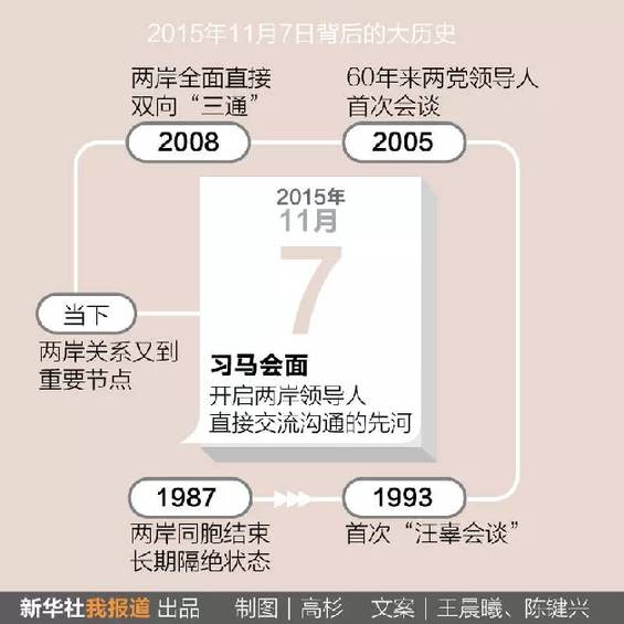 2015年11月7日,兩岸領(lǐng)導(dǎo)人習(xí)近平、馬英九將在新加坡會面,就推進(jìn)兩岸關(guān)系和平發(fā)展交換意見。這是兩岸關(guān)系發(fā)展史上具有里程碑意義的大事。(來源:新華社客戶端? 文字:陳鍵興、王晨曦)