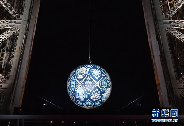 11月23日,在法國(guó)巴黎,一個(gè)名為“地球危機(jī)”的大圓球懸掛在埃菲爾鐵塔上。