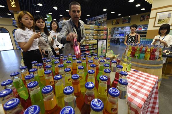 2015年6月8日,中東歐國家特色商品館在浙江寧波開館。圖為一位塞爾維亞商人在寧波中東歐國家特色商品館向參觀者展示商品。(新華社記者鞠煥宗攝)
