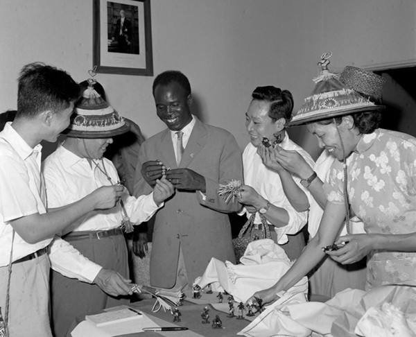 中非人民友好協(xié)會(huì)代表團(tuán)在1961年2月24日到6月19日的四個(gè)月中,訪問了幾內(nèi)亞、馬里、加納、尼日爾等八個(gè)西非國家。圖為非洲朋友向代表團(tuán)贈(zèng)送禮品。(新華社記者孟憲全攝)