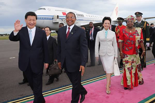 圖為2013年3月24日,國家主席習(xí)近平乘專機(jī)抵達(dá)達(dá)累斯薩拉姆尼雷爾國際機(jī)場,開始對(duì)坦桑尼亞進(jìn)行國事訪問。坦桑尼亞總統(tǒng)基奎特和夫人到機(jī)場迎接習(xí)近平和夫人彭麗媛。(新華社記者 蘭紅光攝)