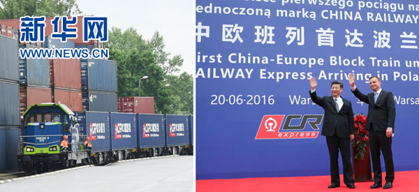 6月20日,國(guó)家主席習(xí)近平同波蘭總統(tǒng)杜達(dá)在華沙共同出席統(tǒng)一品牌中歐班列首達(dá)歐洲(波蘭)儀式。左圖:帶有統(tǒng)一標(biāo)識(shí)的中歐班列鳴笛緩緩駛?cè)胝九_(tái);右圖:兩國(guó)元首向班列揮手致意(拼版照片)。新華社記者 謝環(huán)馳 蘭紅光 攝