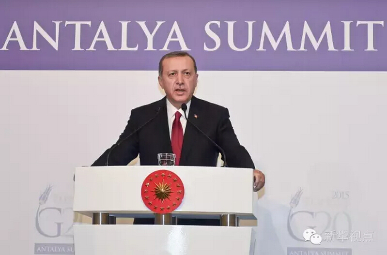 ??? 2015年11月,G20峰會(huì)在土耳其安塔利亞舉行,從安塔利亞到杭州,從地中海岸到錢塘江畔,與東道主接力棒一樣順利傳遞的,是對(duì)推動(dòng)全球經(jīng)濟(jì)穩(wěn)步復(fù)蘇、實(shí)現(xiàn)可持續(xù)增長(zhǎng)的決心?!敖影簟焙蟮闹袊?guó),在議題設(shè)置上既汲取了安塔利亞峰會(huì)的智慧成果,又著眼當(dāng)前、旨在長(zhǎng)遠(yuǎn)、彰顯新意。 2015年G20安塔利亞峰會(huì)上的埃爾多安總統(tǒng)↓