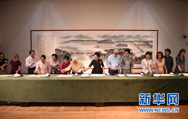 9月5日,國家主席習近平夫人彭麗媛邀請出席二十國集團領導人杭州峰會外方代表團團長夫人參觀中國美術學院。這是彭麗媛與來賓一同書寫漢字“和”。新華社記者 謝環(huán)馳 攝
