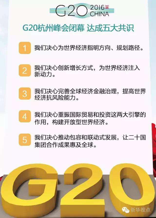 從4日下午,習(xí)近平主席敲下木槌,宣布峰會開幕,至5日下午峰會閉幕。一天半的時(shí)間,領(lǐng)導(dǎo)人在峰會上圍繞會議主題和重點(diǎn)議題進(jìn)行了熱烈而富有成果的討論,就加強(qiáng)政策協(xié)調(diào)、創(chuàng)新增長方式,全球經(jīng)濟(jì)金融治理,國際貿(mào)易和投資,包容和聯(lián)動(dòng)式發(fā)展等議題,以及影響世界經(jīng)濟(jì)的其他突出問題,深入交換看法,達(dá)成許多重要共識。