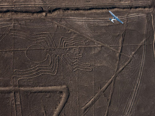 ????站在地面上的話,你幾乎看不到納斯卡線,它們由淺色泥土畫成,兩邊由深色石頭畫的線來提亮。這個(gè)地區(qū)有數(shù)量眾多的納斯卡線——長達(dá)幾千米的碎片狀的三角形和矩形,非寫實(shí)的動物和鳥類圖案:一只猴子,一只禿鷹,一只完全對稱的蜘蛛,一只蜂鳥。