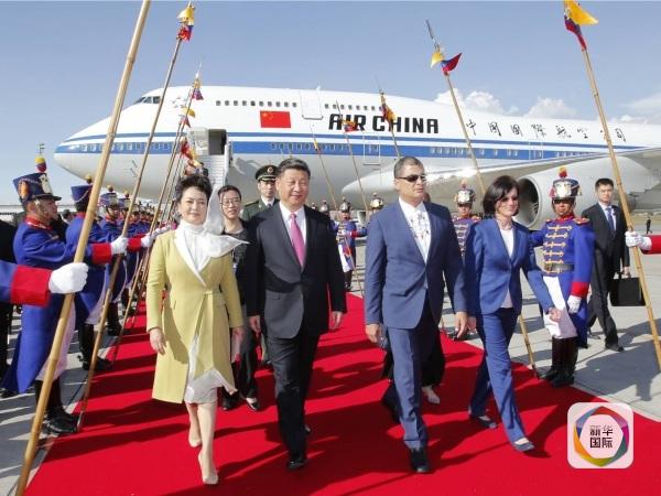 為了迎接習(xí)主席夫婦,科雷亞總統(tǒng)打破厄國內(nèi)《公共典禮條例》和總統(tǒng)不赴機(jī)場迎送外國元首的慣例,親赴機(jī)場主持隆重的歡迎儀式;兩名身著民族服裝的當(dāng)?shù)貎和蛄?xí)主席夫婦獻(xiàn)上鮮花;兩國元首登上檢閱臺,軍樂隊(duì)奏響中厄兩國國歌。習(xí)主席和科雷亞總統(tǒng)分別發(fā)表了熱情洋溢的致辭。