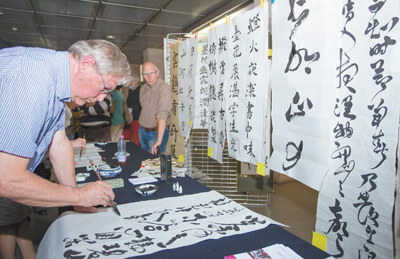 日內(nèi)瓦大學(xué)孔子學(xué)院舉辦的中國(guó)書(shū)法展示活動(dòng)上,一位當(dāng)?shù)貪h語(yǔ)愛(ài)好者展示書(shū)法技藝。