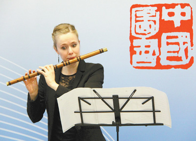 1月11日,在瑞士蘇黎世大學(xué),一名當(dāng)?shù)貙W(xué)生在“中國(guó)圖書(shū)中心”揭幕儀式上表演笛子獨(dú)奏。