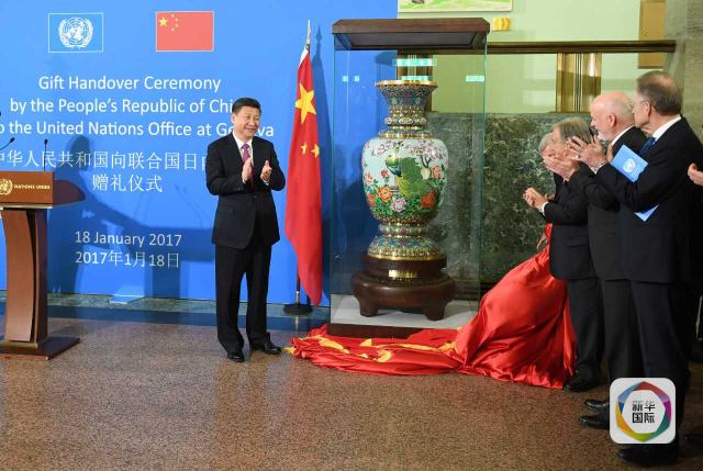 ——向萬國宮贈送景泰藍瓶。萬國宮一層大廳內(nèi),習(xí)主席和古特雷斯共同為名為“盛世歡歌”的景泰藍瓶揭幕。