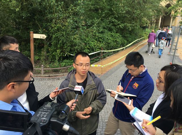 2017年7月3日,德國柏林動物園,陪伴大熊貓“夢夢”和“嬌慶”來到這里的成都大熊貓繁育研究基地飼養(yǎng)員尹洪接受記者采訪。(新華社記者蔣國鵬攝)