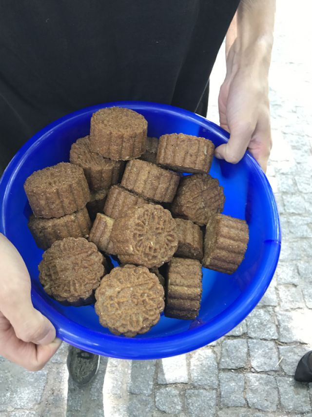 2017年7月3日,德國柏林動物園,陪伴大熊貓“夢夢”和“嬌慶”來到這里的成都大熊貓繁育研究基地飼養(yǎng)員鄭浩為記者展示由米粉、面粉、大豆粉、玉米粉等做成的月餅狀的“熊貓零食”。(新華社記者劉暢攝)