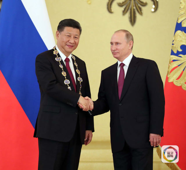 7月4日,國家主席習(xí)近平在莫斯科克里姆林宮同俄羅斯總統(tǒng)普京舉行會談。這是會談后,普京向習(xí)近平授予俄羅斯國家最高勛章“圣安德烈”勛章。新華社記者 劉衛(wèi)兵 攝