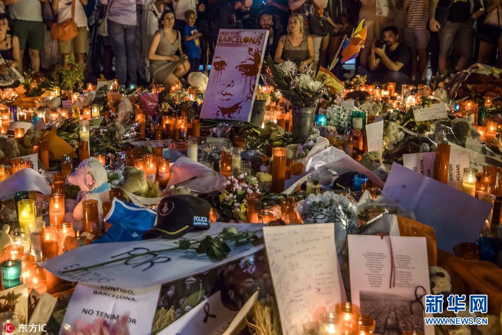 當(dāng)?shù)貢r(shí)間2017年8月18日,西班牙巴塞羅那,當(dāng)?shù)孛癖婞c(diǎn)燭獻(xiàn)花悼念恐襲事件遇難者。17日,一輛白色貨車在巴塞羅那市中心蘭布拉大道加泰羅尼亞廣場附近沖撞人群,據(jù)媒體報(bào)道,死亡人數(shù)已經(jīng)升至14人。(圖片來源:東方IC)