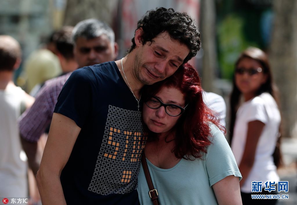 當?shù)貢r間2017年8月18日,西班牙巴塞羅那,當?shù)孛癖婞c燭獻花悼念恐襲事件遇難者。17日,一輛白色貨車在巴塞羅那市中心蘭布拉大道加泰羅尼亞廣場附近沖撞人群,據(jù)媒體報道,死亡人數(shù)已經(jīng)升至14人。(圖片來源:東方IC)