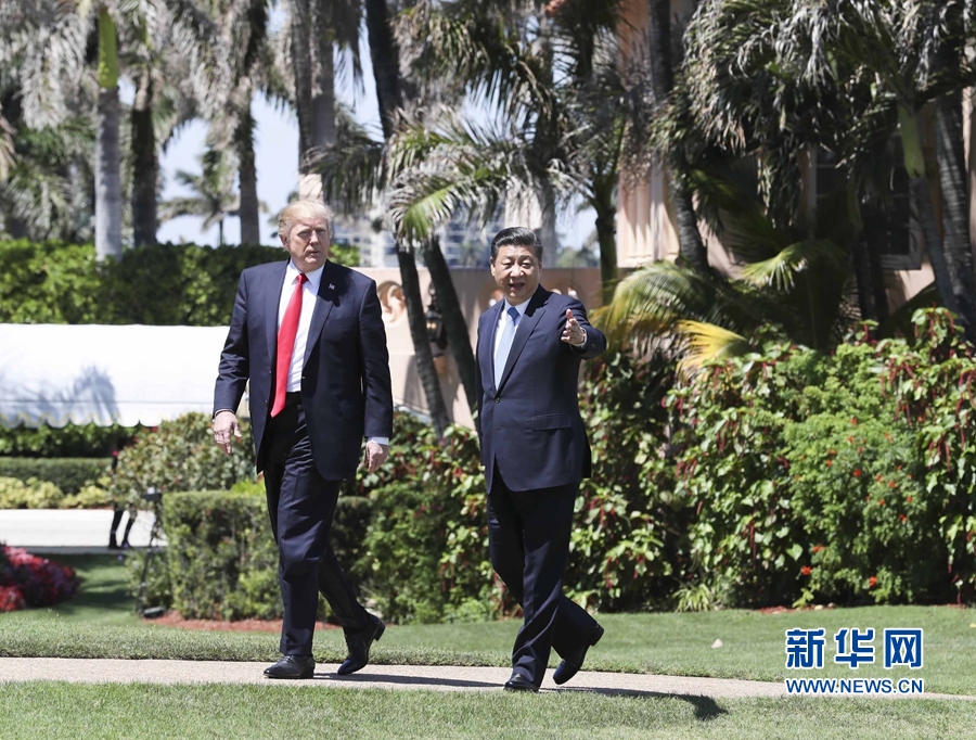 2017年4月7日,國家主席習(xí)近平在美國佛羅里達(dá)州海湖莊園同美國總統(tǒng)特朗普舉行中美元首第二場正式會晤。會晤后,習(xí)近平同特朗普到秀麗宜人的海湖莊園中散步,在輕松友好的氣氛中繼續(xù)就兩國友好合作進(jìn)行討論。 新華社記者 蘭紅光 攝