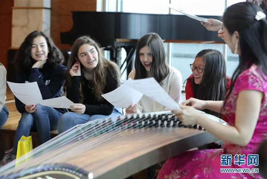 2017年5月5日,在中國(guó)駐美國(guó)紐約總領(lǐng)館舉行的“感知中國(guó)”活動(dòng)中,一名老師為美國(guó)學(xué)生展示古箏彈奏。新華社記者王迎攝