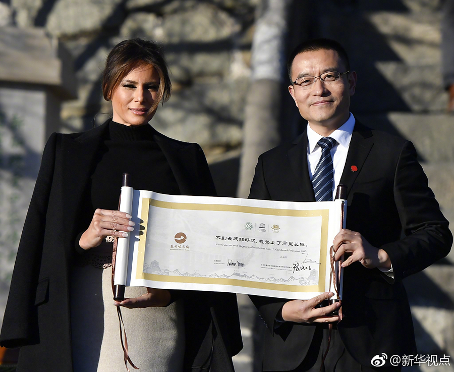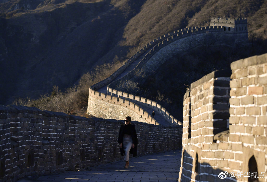 新華網(wǎng)北京11月10日電 11月10日下午,美國總統(tǒng)特朗普夫人梅拉尼婭登上慕田峪長城,獲贈“好漢證書”。北風(fēng)雖然凜冽,但蜿蜒的長城氣勢磅礴,引得梅拉尼婭流連忘返。(記者朱超、燕雁 據(jù)新華社“新華視點(diǎn)”微博報(bào)道)?????