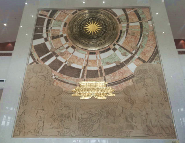 剛剛竣工的越中友誼宮,即將迎來一場盛大的落成移交儀式。記者抵達(dá)時(shí),花匠們正在門口精心布置,用鮮花擺出中國和越南國旗的式樣。步入大廳,由中央美術(shù)學(xué)院歷時(shí)七個(gè)月設(shè)計(jì)的大型壁畫《山水相依 友誼長存》撲入眼簾——核心元素是中越古代共有的樂器“銅鼓”,寓意兩國文化交融源遠(yuǎn)流長。畫面中下部是身著傳統(tǒng)服飾的中越民眾形象,或翩翩起舞,或引吭高歌,或手捧豐收果實(shí),喜樂祥和中傳遞著中越之間濃厚的情誼。