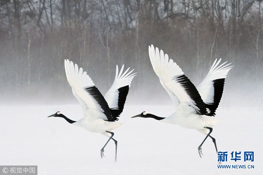 12月25日訊(具體拍攝時間不詳),日本北海道,一對丹頂鶴在冰面上翩翩起舞,動作驚人一致。(圖片來源:視覺中國)