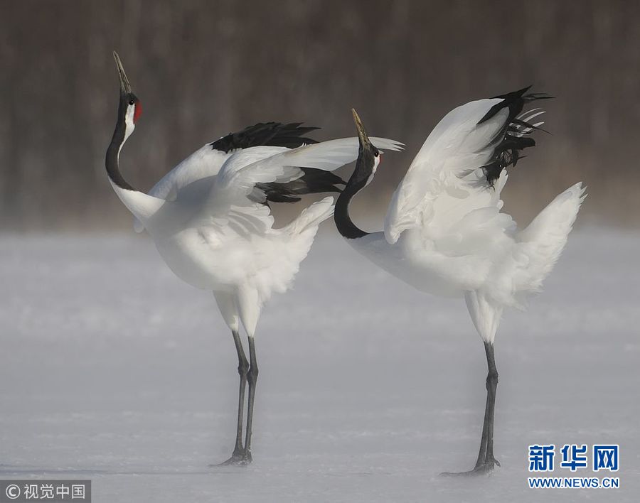 12月25日訊(具體拍攝時(shí)間不詳),日本北海道,一對丹頂鶴在冰面上翩翩起舞,動(dòng)作驚人一致。(圖片來源:視覺中國)