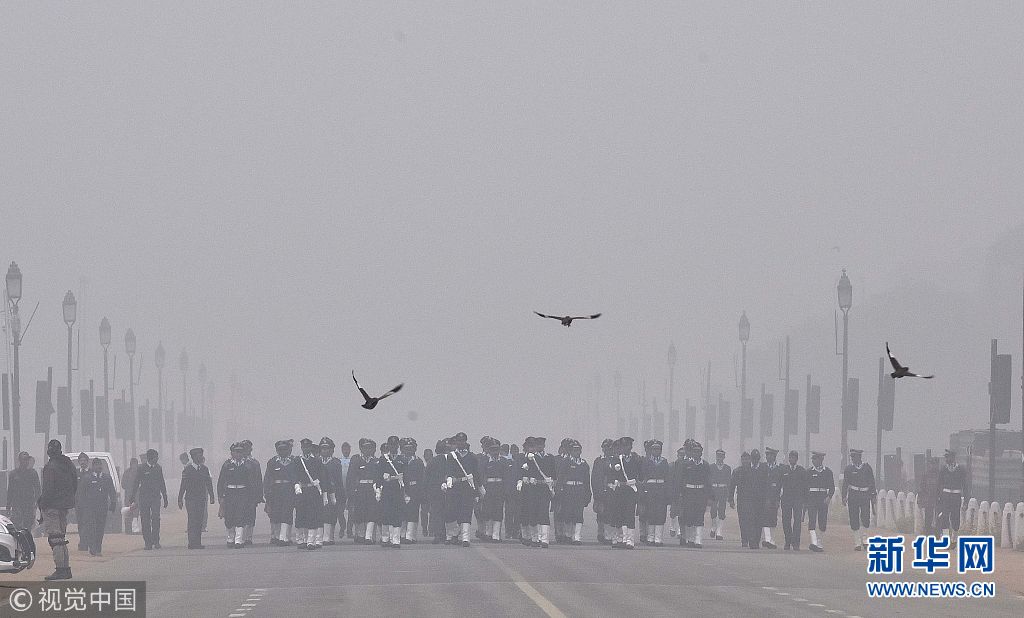 印度新德里遭遇強(qiáng)霧霾 士兵排練閱兵遭“霾藏”