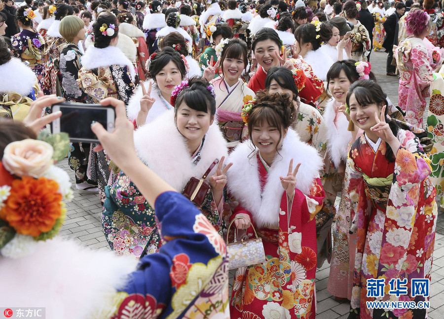日本和服妹子出席“成人節(jié)”慶祝儀式 開心玩自拍