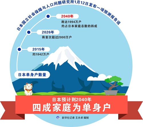 新華社東京1月13日電(記者華義)日本國立社會(huì)保障與人口問題研究所12日發(fā)布一項(xiàng)預(yù)測(cè)報(bào)告說,到2040年日本單身戶將占日本家庭總數(shù)的約四成。日本老齡化和獨(dú)居現(xiàn)象日益加劇。