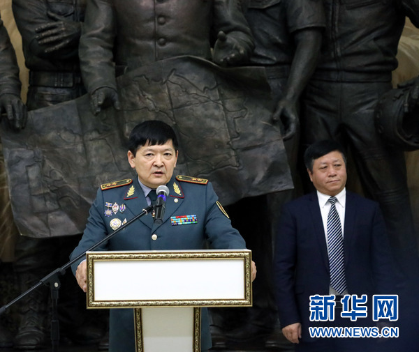 哈薩克斯坦國防部副部長穆赫塔羅夫在圖片展開幕式上致辭。新華網(wǎng)發(fā)