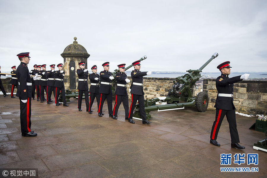 英國(guó)皇家炮兵在愛丁堡城堡鳴響21響禮炮 紀(jì)念女王登基66周年