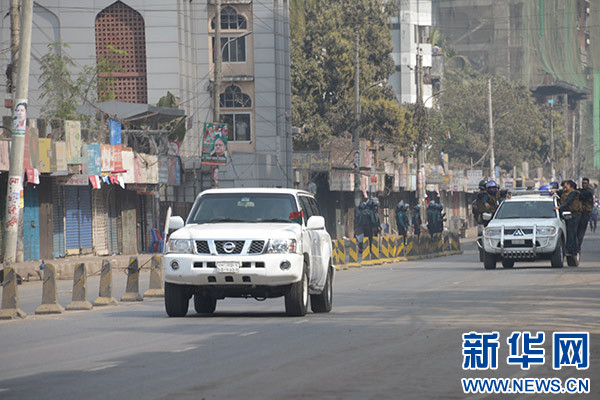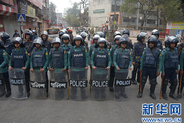 2月8日,在孟加拉國首都達(dá)卡,警察在街頭警戒。新華社發(fā)(薩利姆·禮薩 攝)