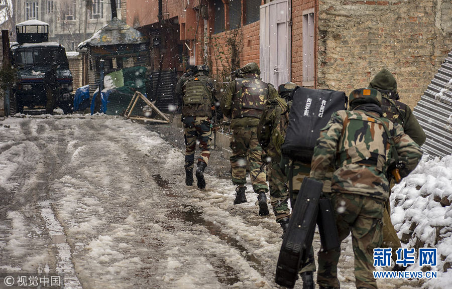 2月12日,印控克什米爾斯利那加,印度政府軍與疑似激進分子展開槍戰(zhàn)。兩名持槍歹徒在他們的營地附近開火致一名印度準軍事部隊士兵死亡。(圖片來源:視覺中國)
