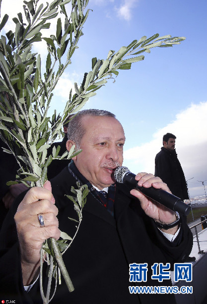 當(dāng)?shù)貢r(shí)間2018年2月17日,土耳其埃斯基謝希爾,土耳其總統(tǒng)埃爾多安出席正義與發(fā)展黨集會(huì),手持橄欖枝發(fā)表講話(huà)。(圖片來(lái)源:東方IC)