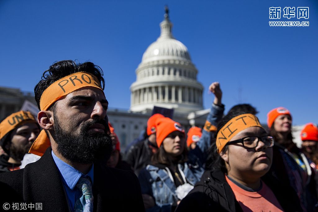 當(dāng)?shù)貢r(shí)間2018年3月5日,美國華盛頓,移民活動(dòng)家在國會(huì)山舉行集會(huì),抗議特朗普終結(jié)“夢想法案”計(jì)劃。(圖片來源:視覺中國)