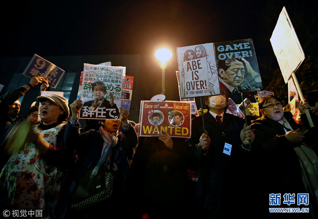 3月12日,日本東京,日本民眾在首相府邸前游行抗議。安倍晉三此前就森友學(xué)園丑聞事件的文件被篡改一事道歉。(圖片來(lái)源:視覺中國(guó))