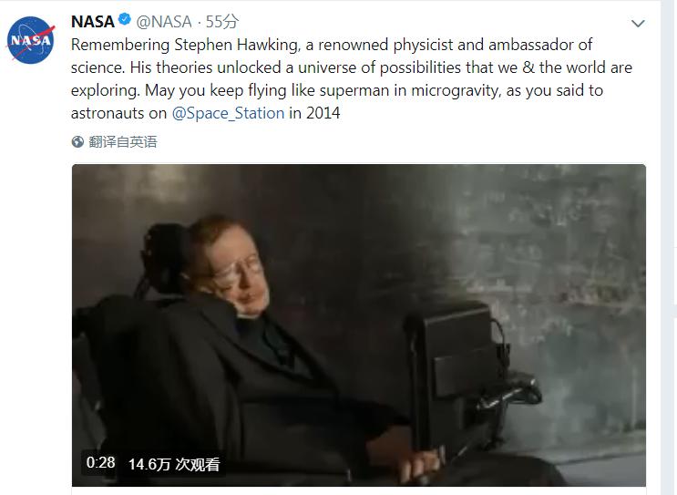 美國國家航空航天局(NASA)14日在推特上發(fā)文稱,霍金的理論為我們的探索開啟了一系列可能。愿你像超人一樣飛行于微重力中。