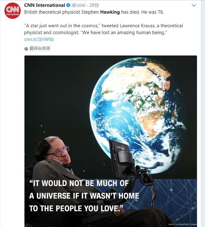 美國有線電視新聞網(wǎng)(CNN)引用理論物理學(xué)家、宇宙學(xué)家Lawrence Krauss的推特說:“一顆星剛剛在宇宙中熄滅,我們失去了一位了不起的人”。