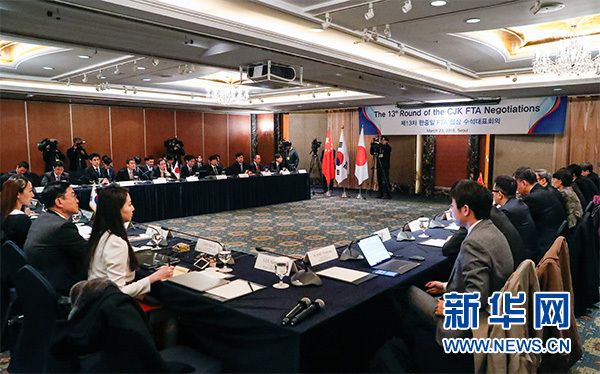 3月23日,中日韓自貿(mào)區(qū)第十三輪談判首席談判代表會(huì)議在韓國(guó)首爾舉行。新華社記者 王婧嬙 攝