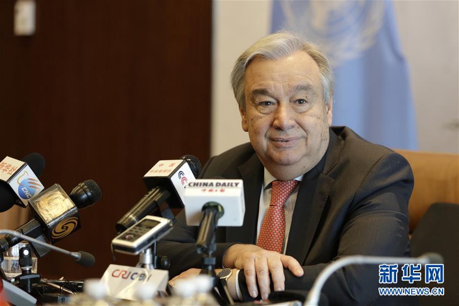 ?。丛拢等?,在位于紐約的聯(lián)合國總部,聯(lián)合國秘書長古特雷斯(右一)接受中國媒體聯(lián)合采訪。新華社記者李木子攝
