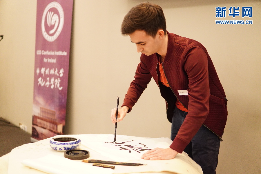 參賽者在表演中國書法。4月7日,第17屆“漢語橋”世界大學(xué)生中文比賽愛爾蘭賽區(qū)選拔賽在首都都柏林舉行。新華網(wǎng)發(fā)