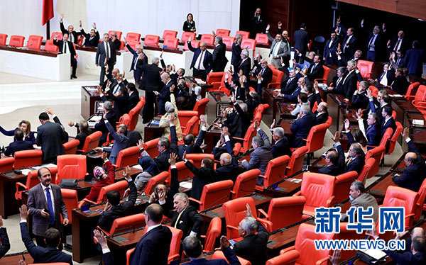 4月18日,在土耳其安卡拉,土耳其大國民議會(huì)就延長(zhǎng)緊急狀態(tài)進(jìn)行投票。新華社發(fā)