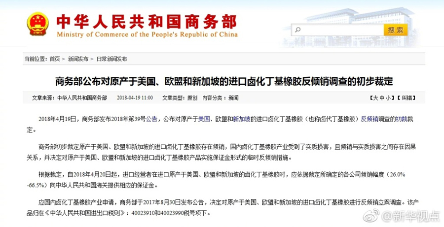 新華網(wǎng)北京4月19日電 商務(wù)部今天發(fā)布公告,初步裁定原產(chǎn)于美國(guó)、歐盟和新加坡的進(jìn)口鹵化丁基橡膠存在傾銷。根據(jù)裁定,自2018年4月20日起,進(jìn)口經(jīng)營(yíng)者在進(jìn)口原產(chǎn)于美國(guó)、歐盟和新加坡的鹵化丁基橡膠時(shí),應(yīng)依據(jù)裁定所確定的各公司傾銷幅度(26.0%-66.5%)向中華人民共和國(guó)海關(guān)提供相應(yīng)的保證金。?(據(jù)新華社“新華視點(diǎn)”微博報(bào)道)