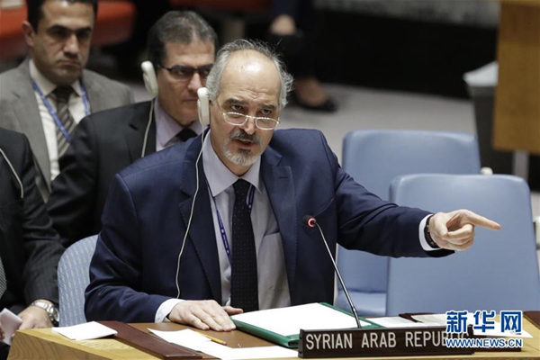 資料圖:2月24日,在位于紐約的聯(lián)合國(guó)總部,敘利亞常駐聯(lián)合國(guó)代表賈法里(前)在安理會(huì)通過敘利亞全境?;饹Q議草案后發(fā)言。新華網(wǎng)記者 李木子 攝