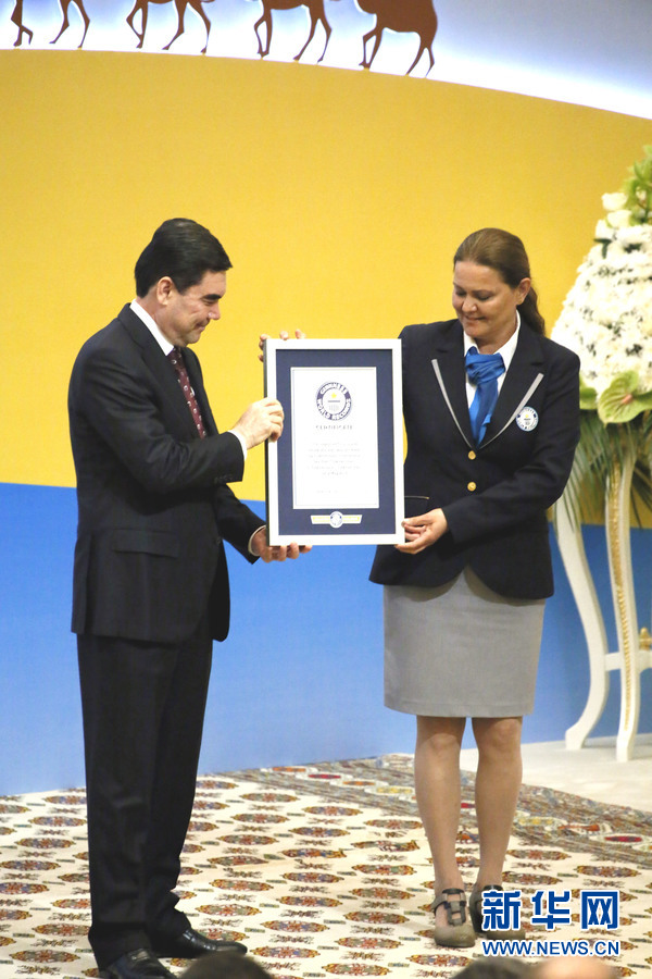 5月2日,世界吉尼斯紀錄總部的代表向土庫曼斯坦總統(tǒng)頒發(fā)相關證書。新華社記者 周良攝