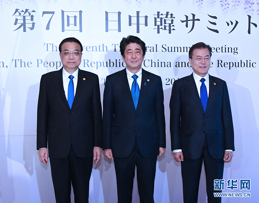 當地時間5月9日上午,國務院總理李克強在東京迎賓館同日本首相安倍晉三、韓國總統(tǒng)文在寅共同出席第七次中日韓領導人會議。 新華社記者饒愛民 攝
