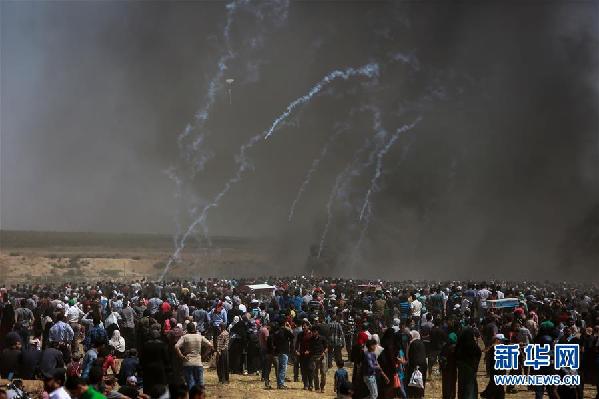 5月14日,在加沙城以東的加沙地帶與以色列交界地區(qū),巴勒斯坦示威者與以色列軍隊發(fā)生沖突。巴勒斯坦民眾14日在巴各地舉行大規(guī)模游行示威,抗議美國駐以色列使館在耶路撒冷開館。新華社發(fā)