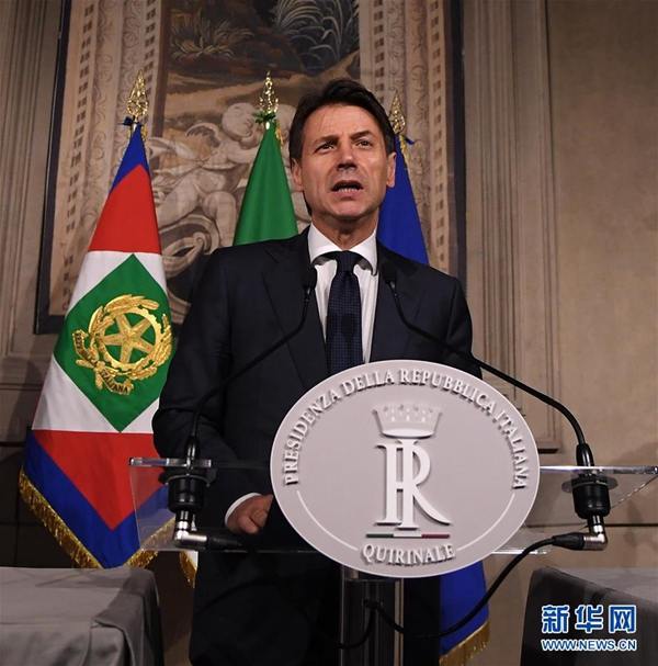 5月27日,在意大利首都羅馬,意新任總理孔特發(fā)表講話。據(jù)當?shù)孛襟w報道,孔特27日晚間與總統(tǒng)馬塔雷拉會面并提交擬定的內(nèi)閣成員名單時,馬塔雷拉否決了由意大利聯(lián)盟黨和五星運動力推的持疑歐立場的經(jīng)濟學家保羅·薩沃納出任財政部長??滋叵蚩偨y(tǒng)提出放棄組閣任務請求,請求得到總統(tǒng)確認。新華社發(fā)(阿爾貝托·林格里亞攝)